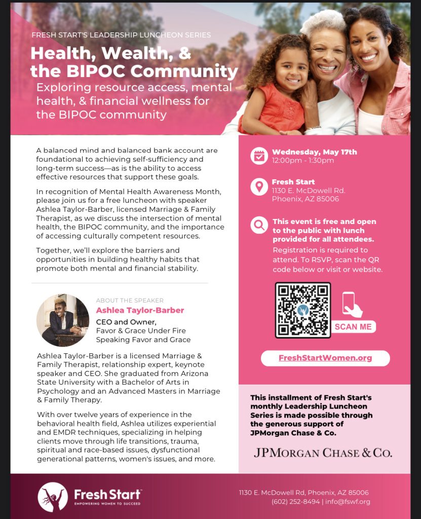 WHEN: Every First Friday of the Month from 12-2pmWHERE: FRESH START WOMEN’S FOUNDATION OR VIRTUAL – This is a hybrid formatRegister here: https://www.eventbrite.com/e/peer-consulting-networking-group-for-mental-health-providers-of-color-tickets-868615210477
